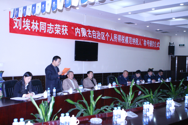 頒獎儀式上,蒙西地方稅務(wù)分局賀占忠局長宣讀了自治區(qū)地稅局的表彰決定,集團公司副總裁包雙江代表劉總接受了榮譽證書和牌匾,集團公司高級會計師靳文同